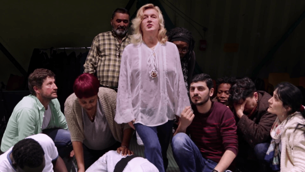 Parler, se mouvoir, jouer à être un autre. En tâtonnant à l’aide de la phonétique au début. Puis au fil des séances, les phrases se déploient, résonnent. Une tirade fait mouche. Une erreur fait rire. Le russe, le pachtoune et l’arabe s’invitent entre les lignes. Guram, Irina, Mohammad, Eugénie, Abdelaziz, Marina et Adam, en attente d’une vie normale en France, se retrouvent chaque semaine au théâtre des émotions. Ils font le pari de monter sur scène dans quelques mois, pour jouer une pièce nourrie de leur histoire.